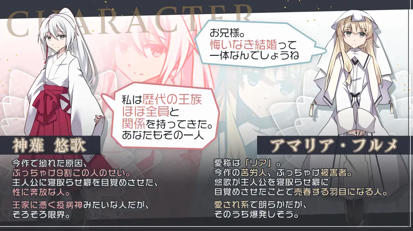游戏介绍双巫婚礼~二人の花嫁~/RJ01457471 主人公に目覚めた寝取らせXPを満たすために聖女と巫女は春を売る―― 作为第二王子的主人公,从小就对一直陪伴在身边的神薙悠歌心生爱慕。 悠歌是两百多年来与这个国家王室从初代开始共同走来的存在。 就这样,主人公的另一个青梅竹马阿玛利亚的婚约话题浮上台面。 在复杂的心情中,主人公接受了悠歌的夜晚邀请,完成了初体验。 然后事后,主人公向她求婚,却从悠歌口中听到震惊的告白。 『我与历代王族几乎所有人都有过关系。你也只是其中之一』 听到这个告白,主人公昏厥过去,醒来时悠歌留下话说会参加与阿玛利亚的婚礼,便消失了踪影。 主人公因悠歌的告白而心灵受伤,某天突然意识到。 无法勃起了。 但在某个条件下,会勃起的事实被发现。 『对自己重要的女性与其他男人上床的事实,会让我勃起』 觉醒这种癖好的主人公努力试图治愈,但没有改善。 在这样的状态下,先前的与阿玛利亚的婚约成立了。 故事从这样的主人公前往阿玛利亚所在的地方开始, 但目的地艾吉尔斯正发生着某场骚动―― 游戏截图![]() 下载链接欢迎光临~ 哎呀,您还不是大会员呢 要给我『3 天空石』才能解锁链接哦 二次元资源尽在AcgFun! | ||||||||||