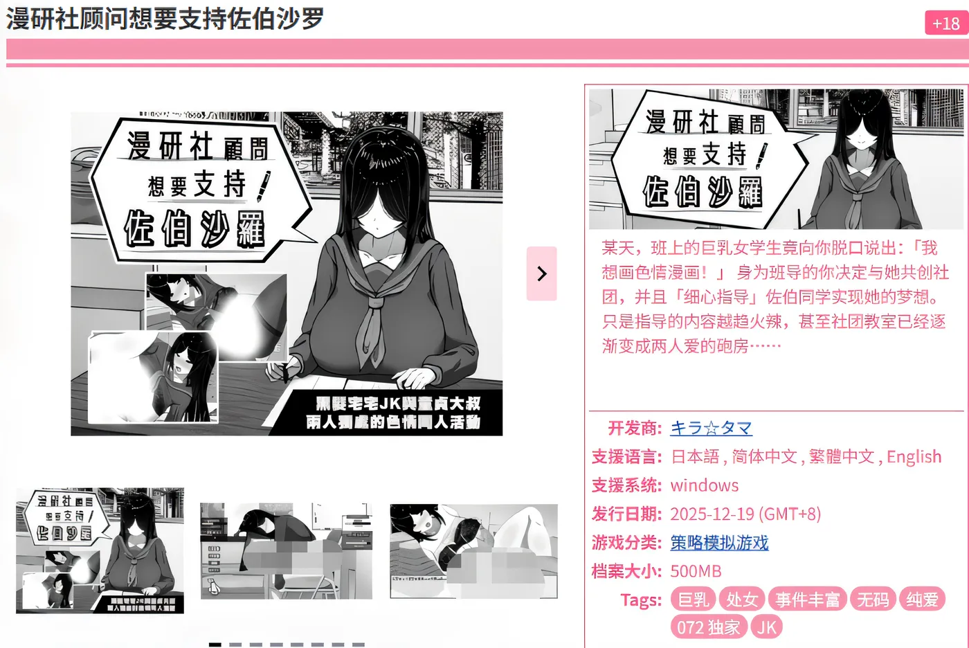 ![]() 游戏介绍✤游戏介绍✤支持内向又害羞沙罗酱,协助她成为独当一面的色情同人作家吧。 透过对话和送礼来解锁沙罗酱的「技能」。 各种行动都会增加主角的性慾。 而一旦自己的性慾高涨至极点,直到射精前将会无法正常行动,请透过自慰或採取其它对策来定期解放性慾。 游戏中即使选错选项也不会game over。 请尽情享受和沙罗酱的同人创作活动。 并且,每完成一本同人誌,好感度就会上升,触发约会事件! 072发售日期12-19 ✤在社办的行动✤ 沙罗酱有时会因为漫画创作的疲劳累积,而在社办睡着。 届时,可以小心翼翼地偷偷对她恶作剧喔。 ✤角色介绍✤【佐伯沙罗】 内向的宅宅女●中生。 被某天偶然看见的色情同人誌打动,从此萌生了自己也想创作的念头。 在班级导师的协助下成立了漫画研究社,和处男中年教师两人在社办共处一室,展开了色情漫画的创作活动。 主角,佐伯沙罗的班级导师,性慾过剩却无处发洩。 兴趣是二次元色情文化,对同人誌、色情同人和商品相当熟悉且精通,现年49岁,还是个处男。 协助沙罗酱创建了漫画研究社,并作为顾问在身旁支持着她。 其实一直以来都在沙罗酱的身后,默默且色色地守护着她。 游戏截图![]() ![]() ![]() ![]() 下载链接欢迎光临~ 哎呀,您还不是大会员呢 要给我『3 天空石』才能解锁链接哦 二次元资源尽在AcgFun! |